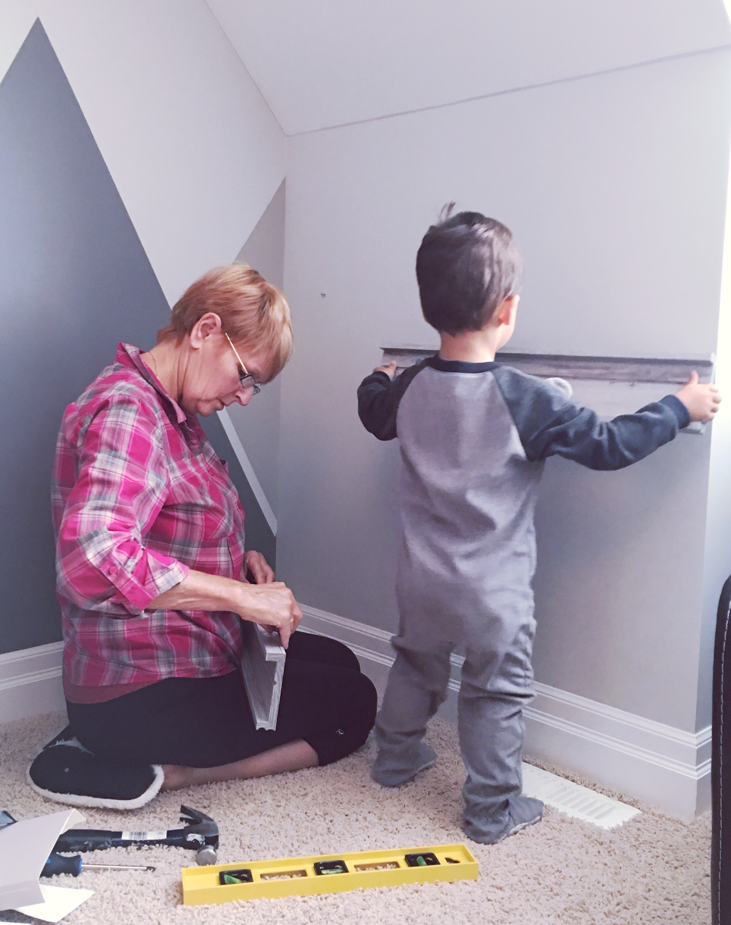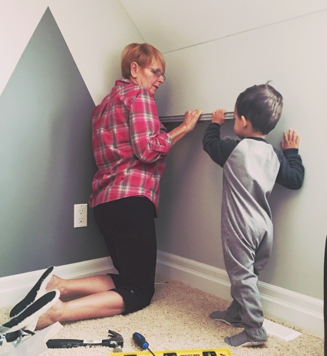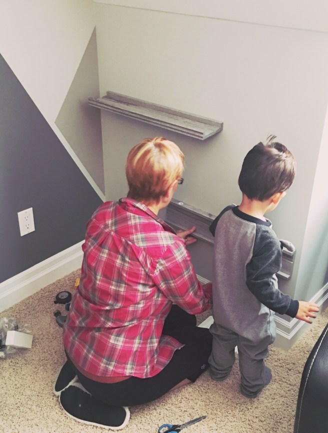 So here we are with our shelves all ready to be hung up when my two year old toddler insisted on bringing his tool box to his room to help install these new shelves.