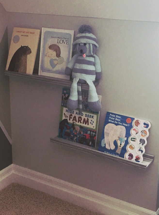 I could never install a shelf myself, but luckily my crafty mom and her little helper have a very useful trick up their sleeves. Use masking tape and a level to figure out where to screw in the screws. About 10 minutes later, voila, the book shelves were up. Such a fun and decorative touch to my sons room!