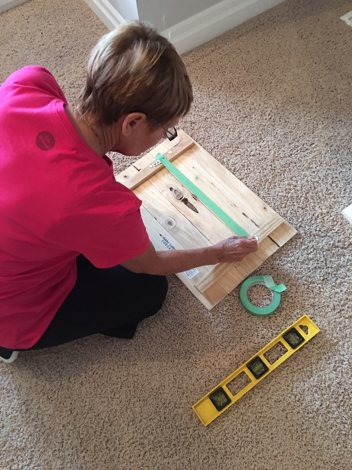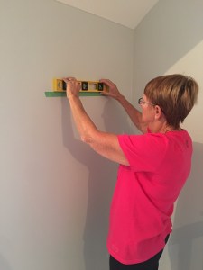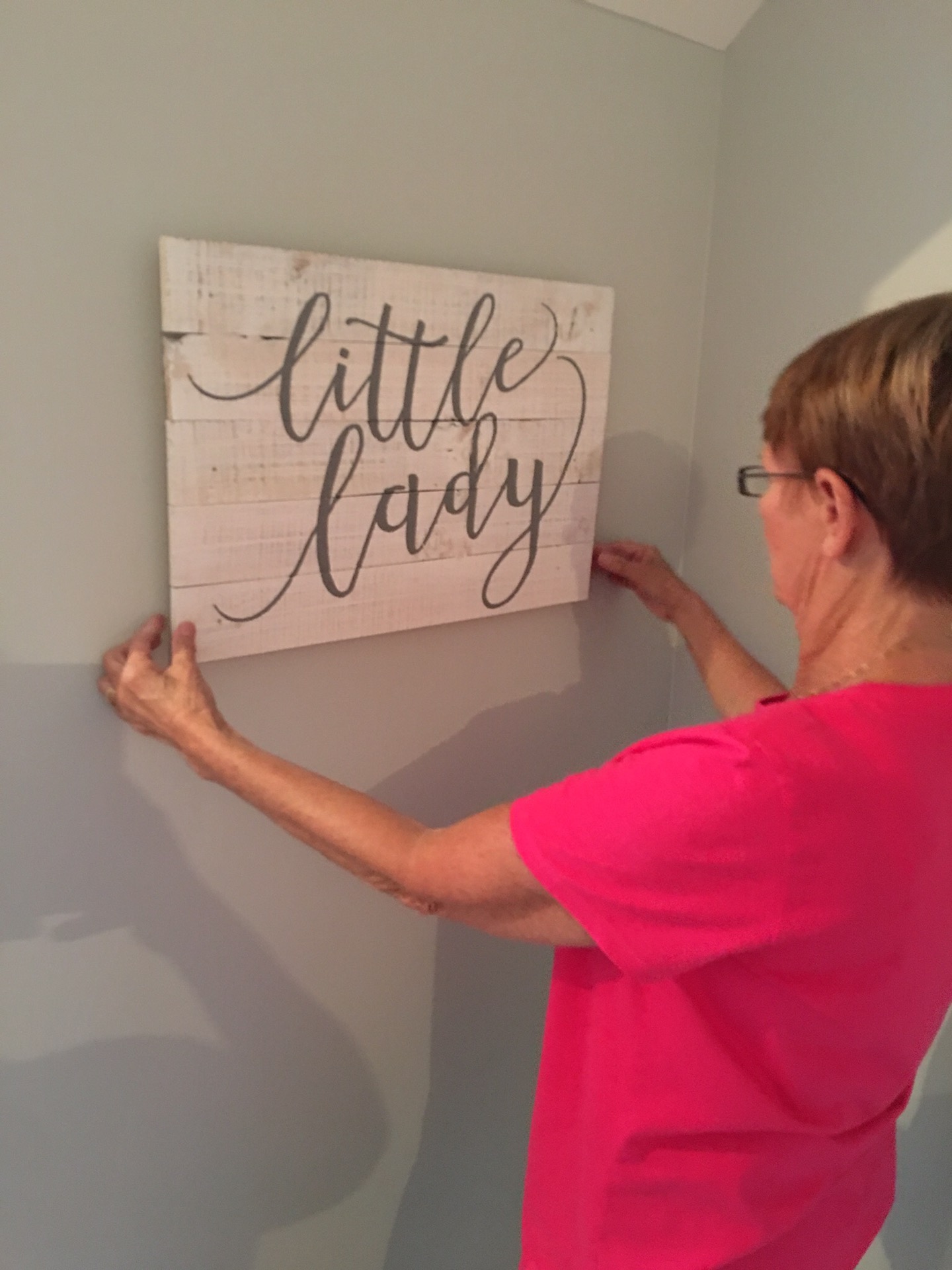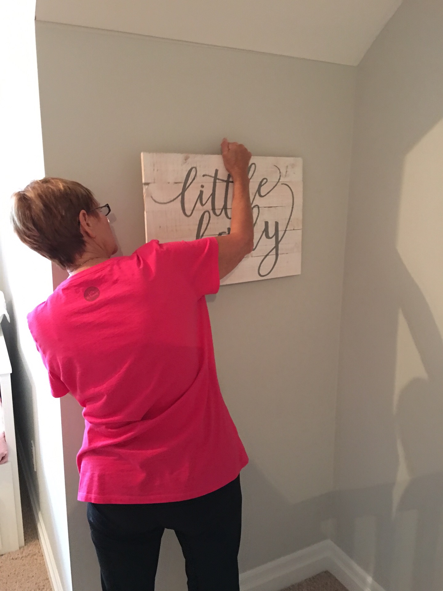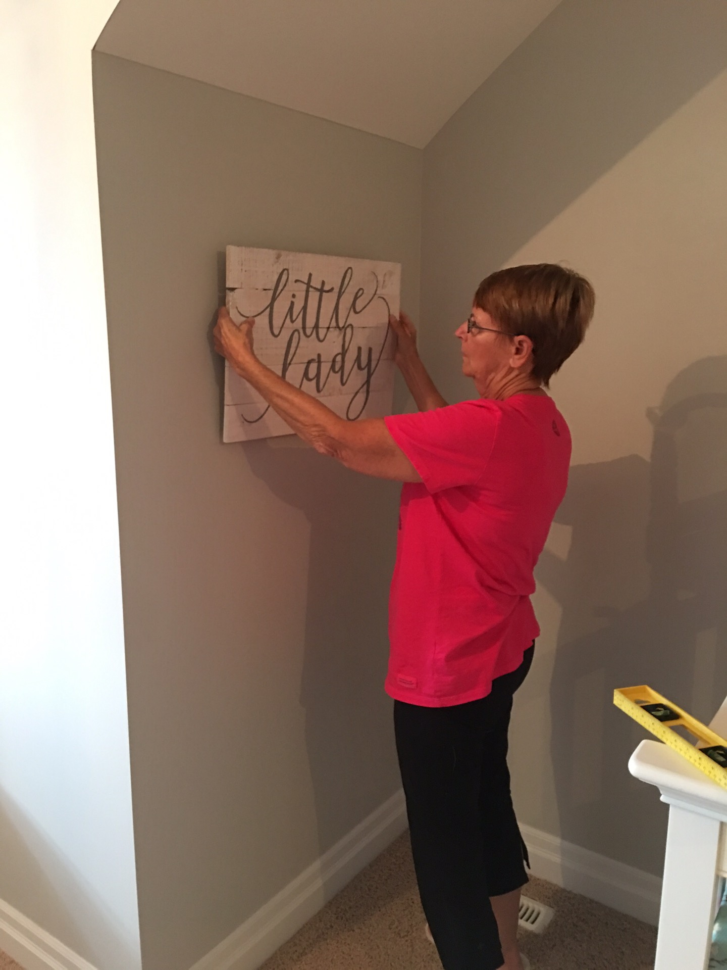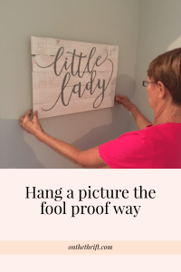 I have never been able to hang up a picture properly that has two hooks on the back. It doesn’t line up straight for me. So when I bought a cute sign to go up in my little baby girls room I quickly called my handy mom for help. She always has tricks up her sleeve to make any job easier.