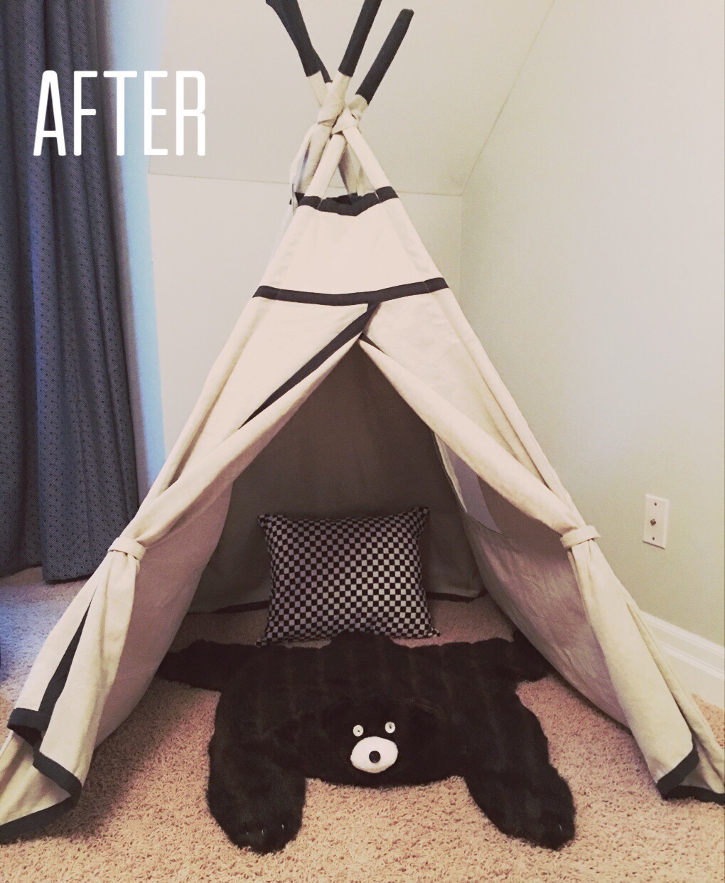 So with the bear rug complete, accessories purchased all that is left is rearranging the room oh and why not add painting mountains on the wall to complete the look (that’s still to come…stay tuned for the big reveal of my sons little man cave room).