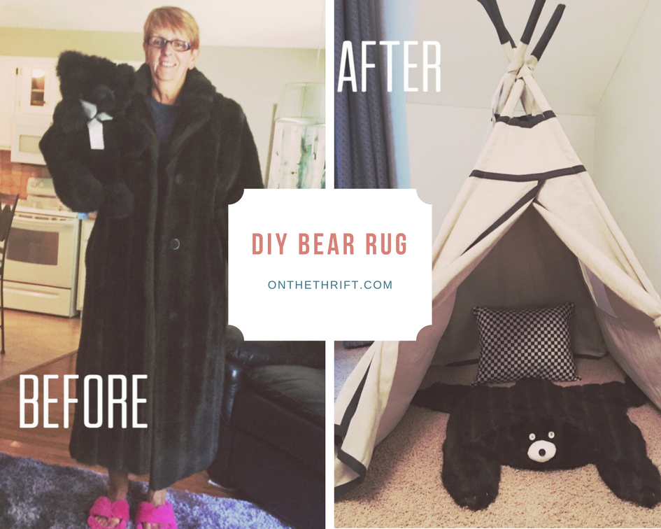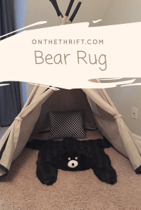 The next day I receive a picture of my mom in an awful looking fur jacket (fake fur of course) and I’m thinking what is she up to now that crazy thrifter. “Well she said, I was in the Goodwill and saw this fur coat and thought that would make a nice bear rug”. Hours later, I receive the next photo, low and behold it was EXACTLY what I wanted and more, a bear rug perfect for my big boys room. It even had a cute big white nose (compliments of my dads never worn, brand new tennis socks turned inside out), cute brown eyes, little ears and of course white claws.